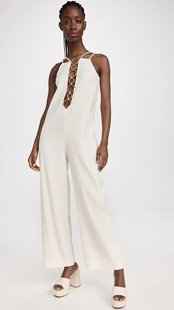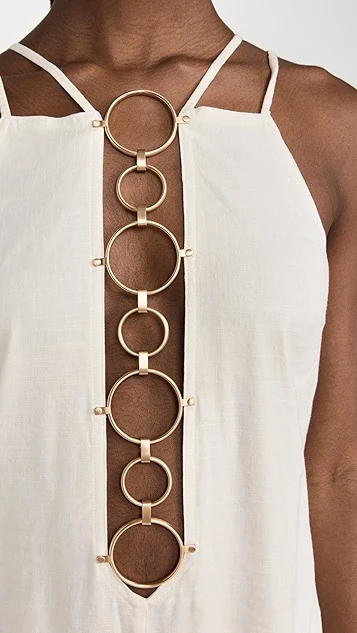 - Plunging cutout neckline with brushed, gold-tone ring accents