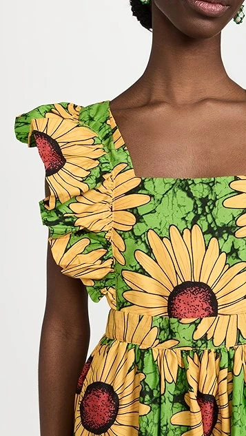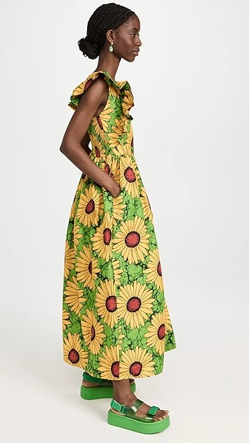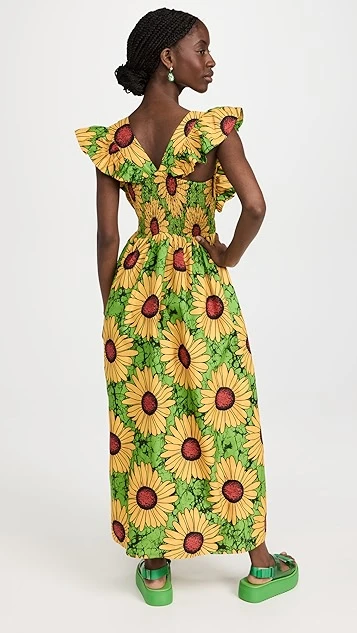 Bright sunflower graphics and verdant leaves combine to bring enticing color to this breezy Elisamama maxi dress. Frilly ruffles add a touch of extra emphasis to the shoulders.