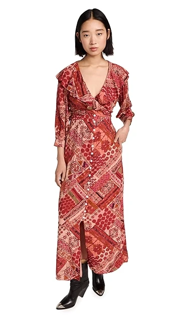 An instantly memorable Free People dress, detailed with intricate patterning and embellished with voluminous ruffles. Ties accentuate the waist, and the deep-V neckline provides a nice opportunity to give a new necklace the spotlight.