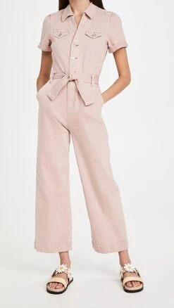 A fresh version of a classic utilitarian style. This PAIGE jumpsuit takes a must-have instant outfit into transitional seasons with rolled short sleeves and a pale pastel wash.