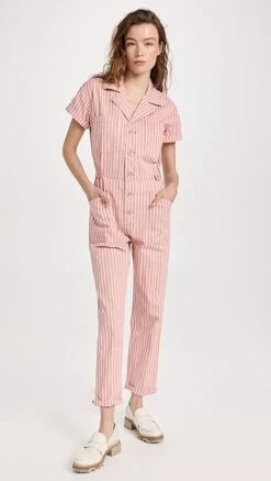 A charming Pistola Denim jumpsuit with a slim cut, featuring a brightly colored stripe pattern and classic utilitarian touches. White loafers and sneakers will both work equally well with this piece.