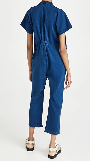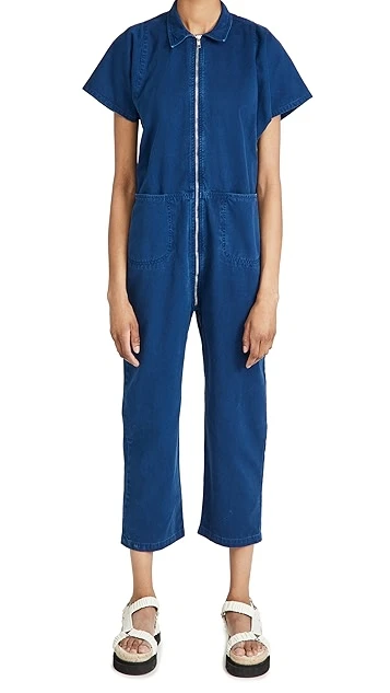 A minimalist Rachel Comey jumpsuit with a utilitarian feel, imbued with deep-blue color and designed with slouchy sleeves. Take advantage of the cropped cut and spotlight a new favorite pair of flat sandals.