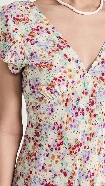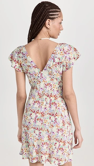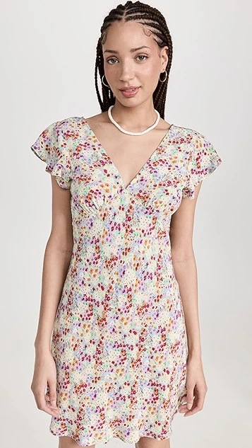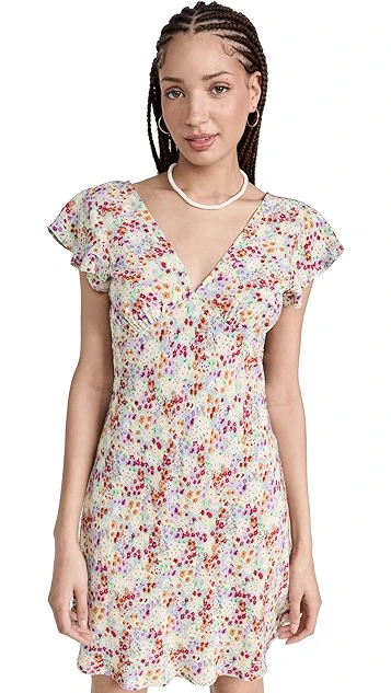 A RAILS mini dress with day-to-night potential, detailed with a dense ditsy print in a vivid color scheme. Diagonal seams add a touch of extra emphasis to the bodice, and understated ruffles accent the shoulders.