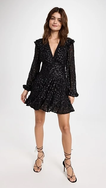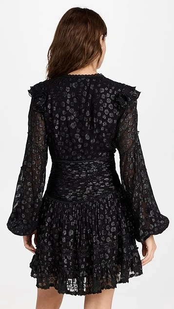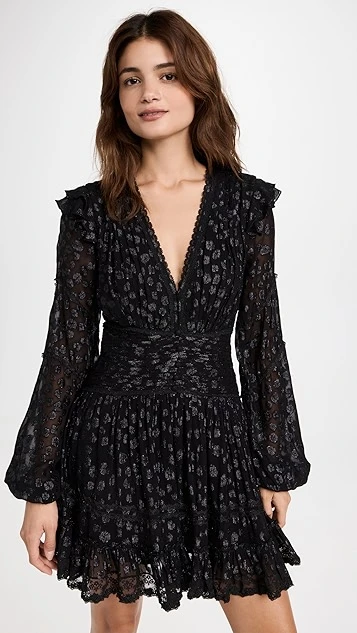 A pretty rendition of a classic little black dress, fresh from ROCOCO SAND. This fluttery silhouette is embellished with an allover flocked pattern, and features a deep-V neckline and gathered waist. Wear yours with the strappy sandals of your choice.